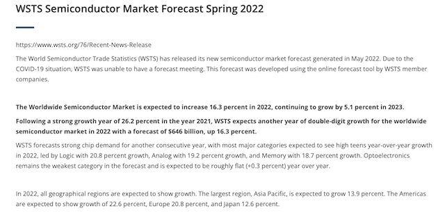 近日,半導(dǎo)體行業(yè)權(quán)威機(jī)構(gòu)世界半導(dǎo)體貿(mào)易統(tǒng)計(jì)協(xié)會(huì)(WSTS)官網(wǎng)發(fā)布了關(guān)于全球半導(dǎo)體市場的最新預(yù)測數(shù)據(jù)。數(shù)據(jù)顯示,2022年世界半導(dǎo)體市場預(yù)計(jì)增長16.3%,到2023年將繼續(xù)增長5.1%。