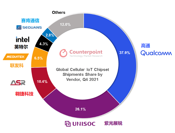 幾乎所有物聯(lián)網(wǎng)終端都需搭載IoT通信芯片,因而通信射頻芯片能夠直觀反映物聯(lián)網(wǎng)行業(yè)的成長周期與終端需求,堪稱行業(yè)風(fēng)向標(biāo)。在Counterpoint發(fā)布的全球蜂窩物聯(lián)網(wǎng)芯片追蹤報(bào)告中,高通、紫光展銳、翱捷科技、聯(lián)發(fā)科、英特爾、Sequans、華為海思等占據(jù)了大部分市場(chǎng)份額。