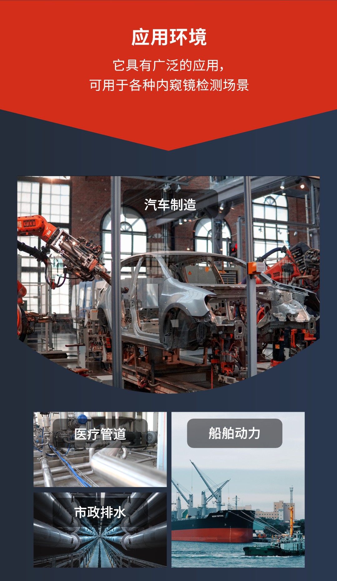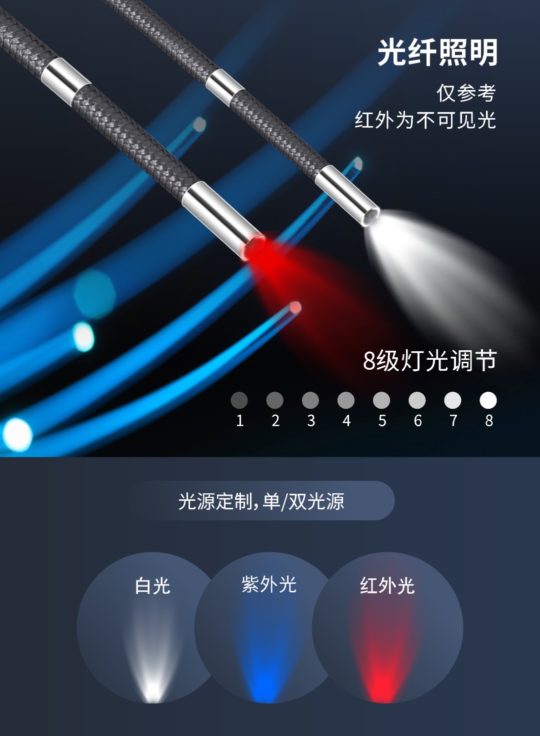 優(yōu)勢特點:紅白雙光源;6英寸大屏;雙電路設(shè)計,單節(jié)電池也能工作;360°旋轉(zhuǎn)探頭